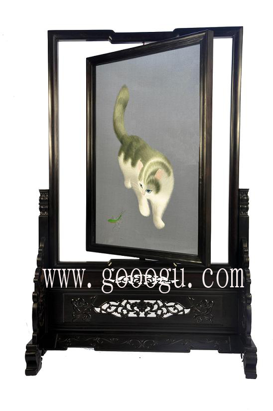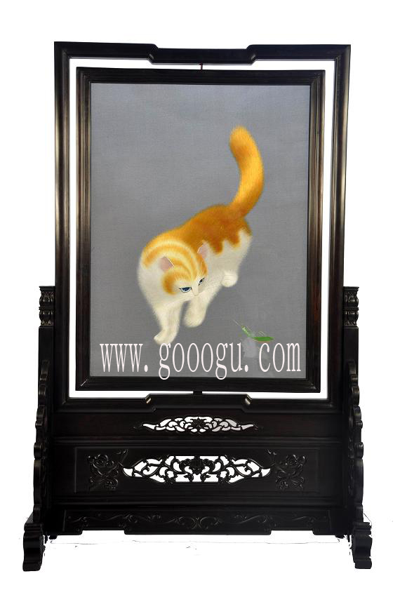 走進嬌古蘇繡的展廳,我們驚嘆于陳列室里作品的浩繁與精致,先來看傳統題材的作品。花鳥繡是蘇繡傳統產品,它是明清時期閨閣繡的延續。蘇繡工藝品《小 貓》、《金魚》曾在國際上得獎,《小貓》的名氣在于貓眼用二十六種不同顏色的絲線繡成;《金魚》的輝煌則是魚尾最細處僅用一根線的四十八分之一。蘇州各大 旅游景點也屢見小貓金魚的姿態,如何擺脫蘇繡工藝品的匠氣,使俗氣的工藝品成為震撼人心的藝術品,這是嬌古蘇繡多年來苦苦研究的問題。看,這幅現代 刺繡藝術品《貓》。同樣是貓,傳統的貓講究具體,形象,栩栩如生。而我們面前的兩幅《貓》:一幅白底白貓,一幅黑底黑貓。貓在哪里?貓在白色里,貓在黑色 里,貓在你無盡的想像里。想像之上,具象已與抽象結合起來,達到了藝術升華。同是蘇繡作品,構思變了,功底卻不改,《貓》作品之外給人的聯想可謂余音裊裊。 |