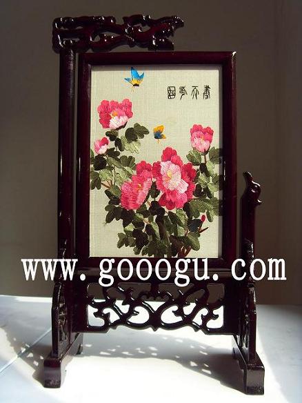 (一) 普通檔蘇州雙面繡:普通檔蘇州雙面繡以其圖案做工一般,框架材質普通(多以菠蘿格為木質),繡片做工多以一根粗線或一絨構成。尺寸方面以小規格為主,常規尺寸為20圓厘米直徑,三十圓厘米直徑,14*20CM(畫心尺寸) 16*25CM(畫心尺寸),30CM圓直徑等。名稱民間稱法不一,筆者就此做簡單的介紹,如單龍頭架,雙龍頭架,同心圓等,。包裝方面目前以簡單禮盒裝為主(筆者認為做為禮品還欠缺,有待改進)。目前以擺在桌面臺屏雙面繡為主。蘇繡圖案多以牡丹,花草,小動物為主,目前整體圖案搭配創新方面不是太強。在國內蘇繡市場普通檔蘇州雙面繡目前所占的比重比較大,普遍價格不高,出廠價一般在一百至兩百元左右。是目前很多企業采購的重點檔次選擇之一。可做為企業商務禮品,會議禮品,紀念禮品。加上燙金工藝,是企業宣傳廣告的好載體之一。