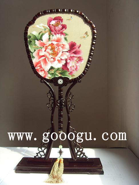 (三)高檔蘇州雙面繡:此款一般配以檀木木質,再配上寬厚的錦盒包裝。目前代表作是蘇州雙面繡紫檀宮扇,20CM直徑的臺屏,葫蘆扇等。此款的最大優點是包裝精美,產品材質高,繡片整體精良。但目前大多商家因為比拼價格因素,偷工減料,以次充好,大大影響了整體品質。圖案方面目前還欠缺嚴重創新。目前此款的出廠價在600元至2000元左右。