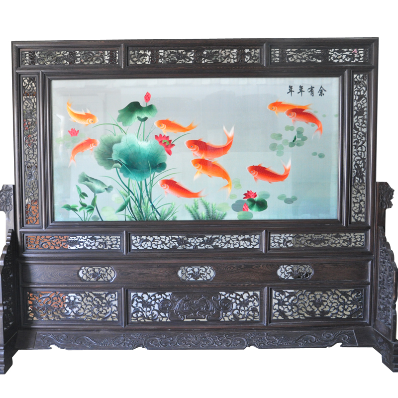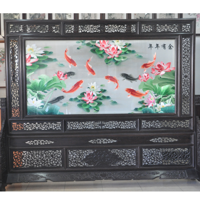 蘇繡屏風 簡易框架 雙面繡 年年有余 雞翅木 家用隔斷