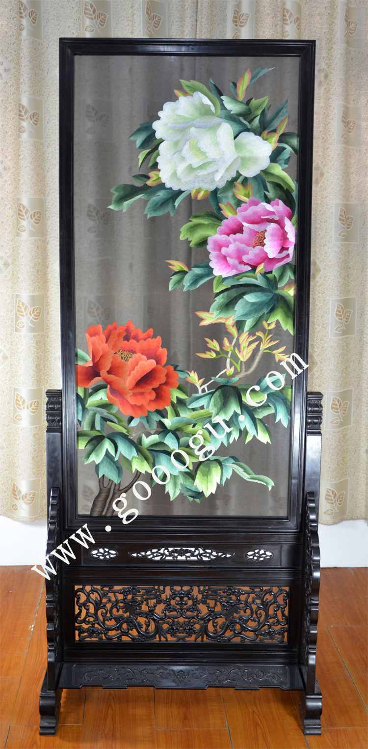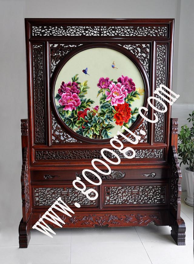 蘇繡牡丹玄關 家用屏風 純手工刺繡 紫檀木工藝品