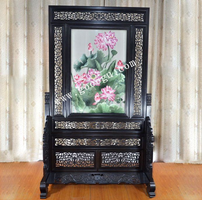 蘇繡玄關屏風 精品荷花 手工刺繡 紫檀架