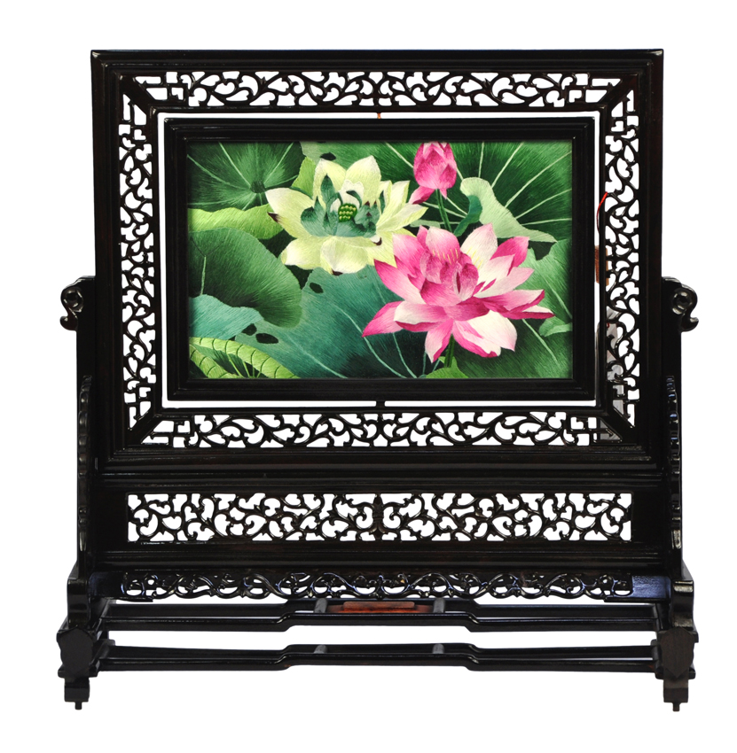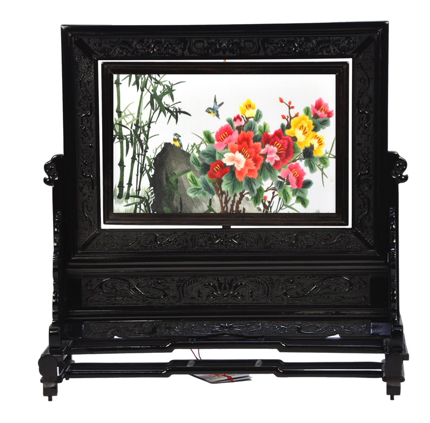 產品描述:紫光檀蘇州雙面繡為蘇州繡娘手工刺繡而成,木框為目前中國蘇州雙面繡材質紫光檀,整體框架花紋雕刻細膩。圖案有花卉(牡丹,梅花,荷花,蘭花等),花鳥,動物(熊貓,老虎,魚等),山水,風景,名家字畫等。圖案多達一百多種,有古色古香的,有現代氣息的,高貴典雅,是贈送客人的特色禮品之一。