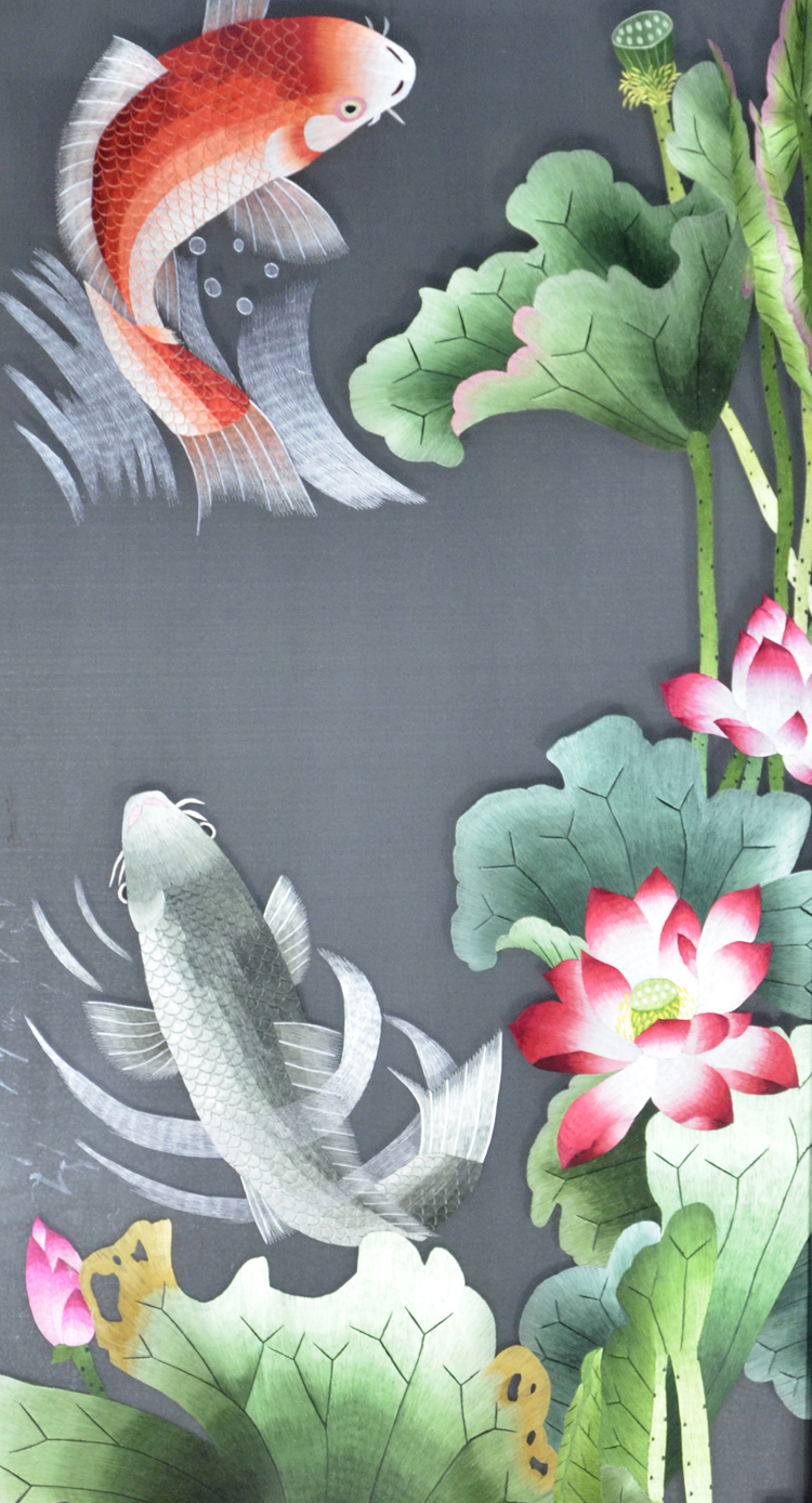 【產(chǎn)品名稱】:荷花魚(yú)屏風(fēng)(雙面繡) (作品代碼:P-1203) 【產(chǎn)品規(guī)格】:圖案尺寸寬度60cm,高度125cm 外框整體尺寸寬100cm,高205cm 【產(chǎn)品工藝】:手工刺繡 【產(chǎn)品材質(zhì)】:真絲面料+雞翅木框+桑蠶絲線+玻璃 【產(chǎn)品包裝】:木箱包裝,用海綿包扎,確保運(yùn)輸安全 【出廠價(jià)】:18000元 【市場(chǎng)零售參考價(jià)】:36000-48000元 【產(chǎn)品運(yùn)輸】:我司負(fù)責(zé)發(fā)往客戶指定地點(diǎn),蘇州附近城市可送貨上門(mén)! 【產(chǎn)品說(shuō)明】:此款荷花魚(yú)雙面繡屏風(fēng),是由蘇州工藝師耗時(shí)數(shù)個(gè)月精心手工刺繡而成,刺繡圖案以傳統(tǒng)的荷花魚(yú)為題材繡工精細(xì)、寓意深刻,顏色搭配均勻過(guò)渡自然,屏風(fēng)的框架選用進(jìn)口的雞翅木為料,是蘇繡屏風(fēng)中的珍稀作品。是居家裝飾的重要裝飾品之一!歡迎親臨嬌古蘇繡展示廳觀看實(shí)物! 【作品欣賞】 .jpg)