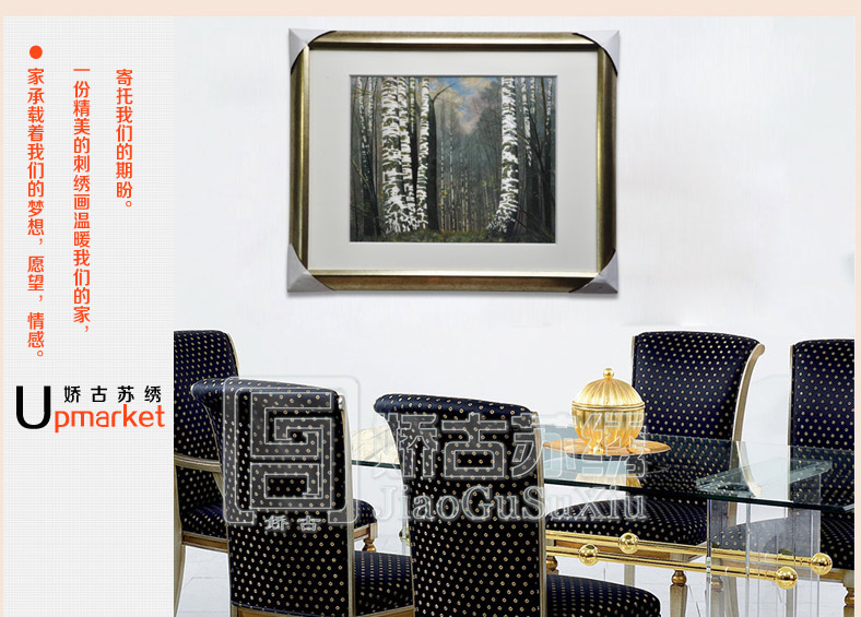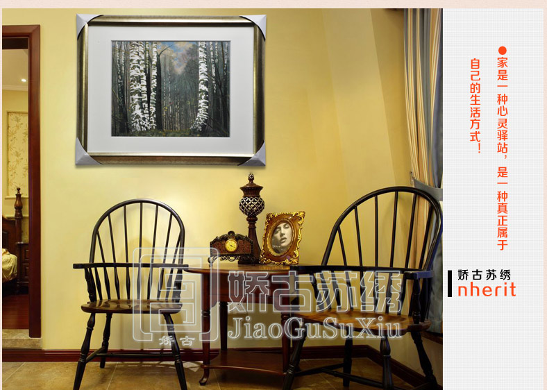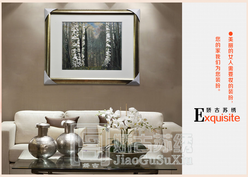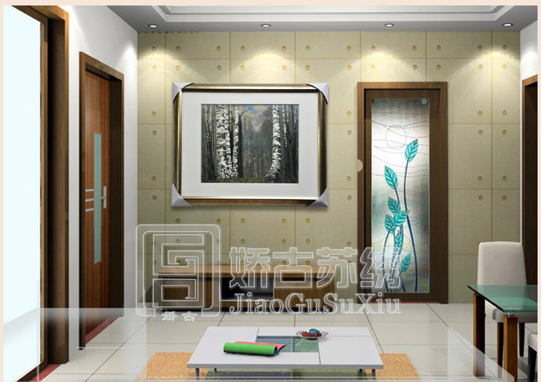 【品 牌】:嬌古 (作品代碼 D-1066)【品 名】:白樺林裝飾畫【尺 寸】:畫心尺寸50*60cm 整體尺寸80*97cm【產品工藝】:手工刺繡【絲線材質】:蠶絲線 【用 途】:政府禮品、外賓禮品、生日禮物、領導升遷、出國禮品等等。【出廠價格】:14800元