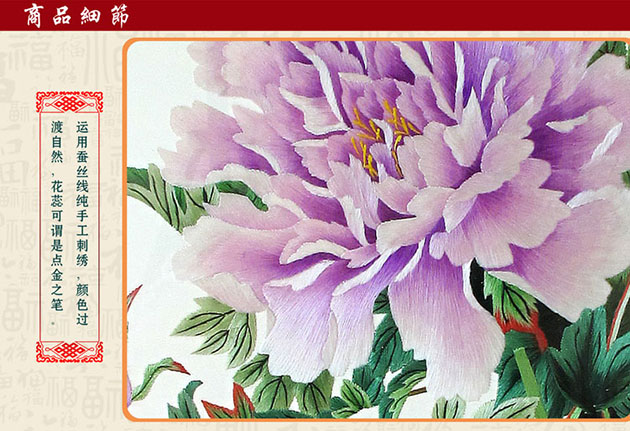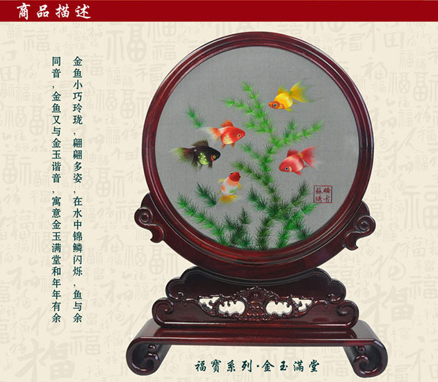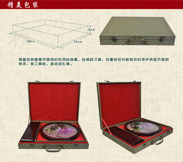 產品名稱:新款擺臺紫氣東來(雙面繡) (作品代碼:XS-289)產品規格:圖案尺寸25CM的圓外框整體尺寸寬39CM,高45CM產品工藝:蘇州繡娘手工刺繡。產品材質:真絲面料+桑蠶絲線+玻璃+紅木 產品包裝:錦盒禮品裝、贈嬌古蘇繡專用手提袋產品重量(含包裝):2KG左右嬌古出廠價:3200元/件